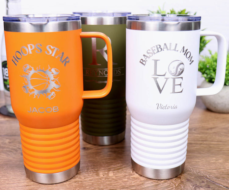 Start your day off right with our customizable 20-ounce travel mugs, designed to fuel your morning commute and keep you energized on-the-go. Our travel mugs are made with durable, BPA-free materials and feature a secure lid to prevent spills, making them the perfect companion for busy professionals, students, and travelers. Personalize your mug with your name, initials, or birth month using our precision laser engraving, and make a statement with every sip. Whether you're sipping coffee, tea, or your favorite hot beverage, our insulated travel mugs will keep it hot for hours, and the unique design will make it stand out from the crowd.