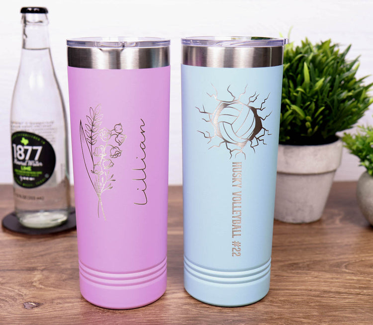 Stay hydrated in style with our 22-ounce skinny tumblers, designed to fit perfectly in your hand or cup holder. Our skinny tumblers are made with durable, BPA-free materials and feature a sleek, slim design that's both fashionable and functional. Personalize your tumbler with your name, initials, and more using our precision laser engraving, and add a touch of personality to your daily hydration routine. Whether you're sipping water, iced tea, or your favorite cold beverage, our insulated skinny tumblers will keep it cold for hours, and the unique design will make it stand out from the crowd. Perfect for on-the-go hydration, our skinny tumblers are a must-have accessory for fitness enthusiasts, busy professionals, and anyone looking to stay refreshed and stylish.