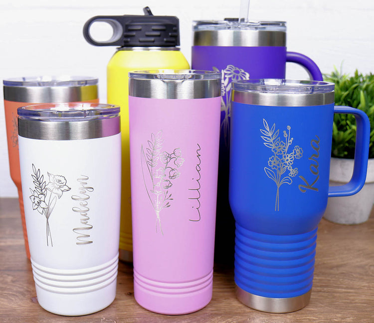 Celebrate your unique spirit and birth month with our beautiful birth flower personalized tumbler collection. Each tumbler is carefully laser engraved with the delicate flower that represents your special month, paired with your name or a loved one's name, making for a thoughtful and meaningful gift. Our tumblers come in a variety of shapes, sizes, and colors to fit your personal style. From January's Carnation to December's Holly, our birth flower tumblers are the perfect way to showcase your individuality and add a touch of personality to your daily routine. Whether you're sipping coffee, tea, or your favorite beverage, our insulated tumblers will keep it hot or cold for hours. Find your birth flower and create a one-of-a-kind tumbler that's truly yours.