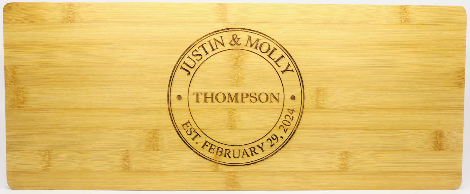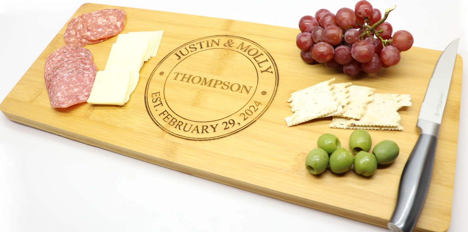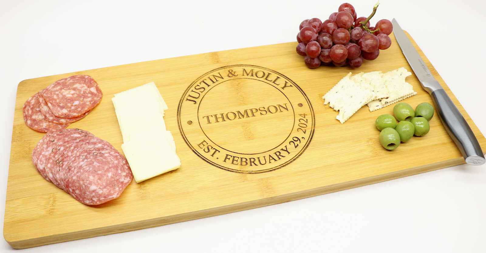 Discover the perfect gift for couples who love to entertain! Our sustainable bamboo charcuterie board is not only environmentally friendly, but also personalized with their names. Encourage them to share delicious treats and create lasting memories with this thoughtful and unique gift!