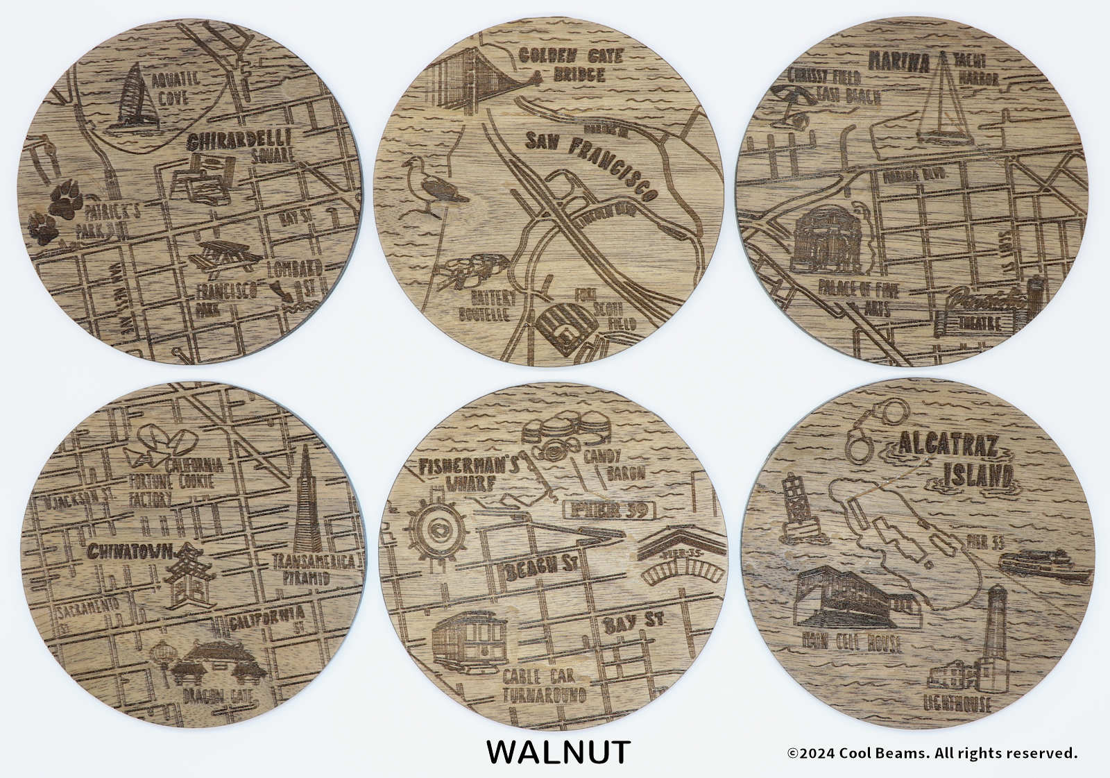 Elevate your home decor with our San Francisco California Solid Wood Coaster Set! Each coaster features different street map segments and iconic landmarks, showcasing the beauty of the city. Crafted from premium wood, these coasters are not only stylish but also durable. Choose from a variety of wood options to match your personal style. Bring the spirit of San Francisco into your home with these unique and practical coasters!